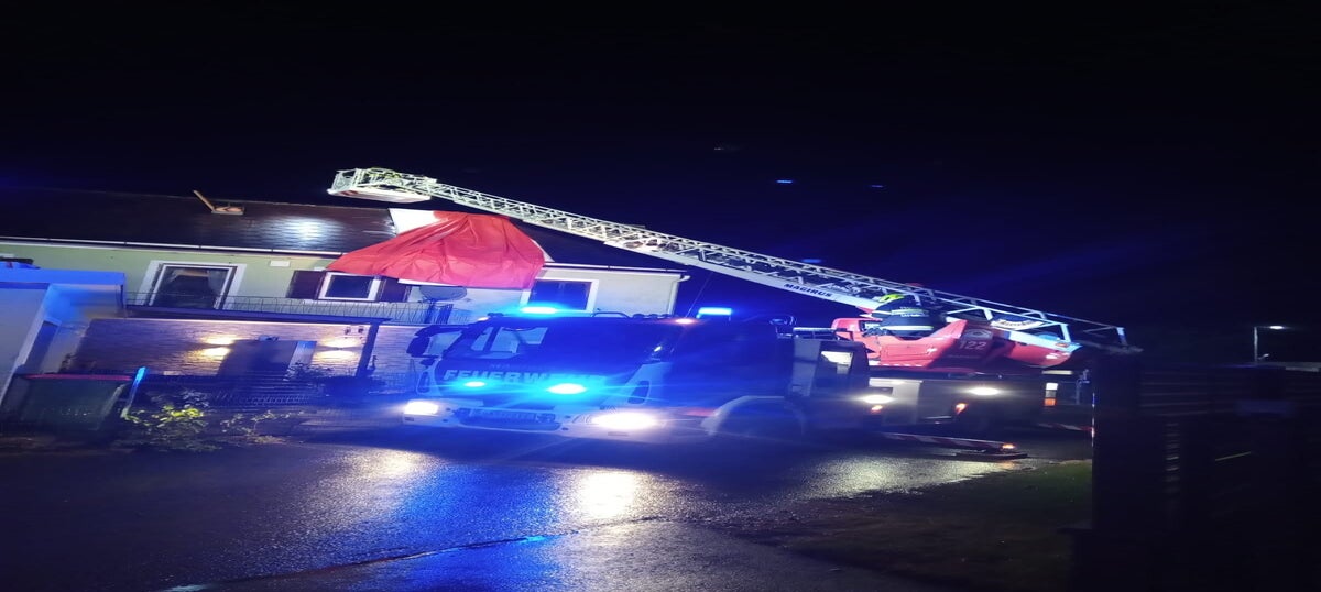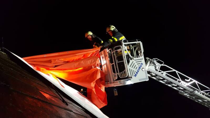 Am 03.10.2020 um 19:42 wurde die FF Halbenrain mit dem Stichwort "T01 Dach undicht" zu einem Einsatz im OT Halbenrain gerufen. Einsatzgrund: Ein Teil des Eternitdaches eines Einfamilienhauses wurde durch heftige Sturmböen abgedeckt. Der Hausbesitzer schlug Alarm und rief die FF Halbenrain zu Hilfe. Einsatzleiter HFM Alois Krauthackl ließ nach der Lageerkundung die FF Bad Radkersburg mit der Drehleiter nachalarmieren. Das Dach wurde mit Planen abgedeckt und mit Brettern vernagelt. Nach ca. 2 Stunden war der Einsatz beendet und die Feuerwehren wieder einsatzbereit.
